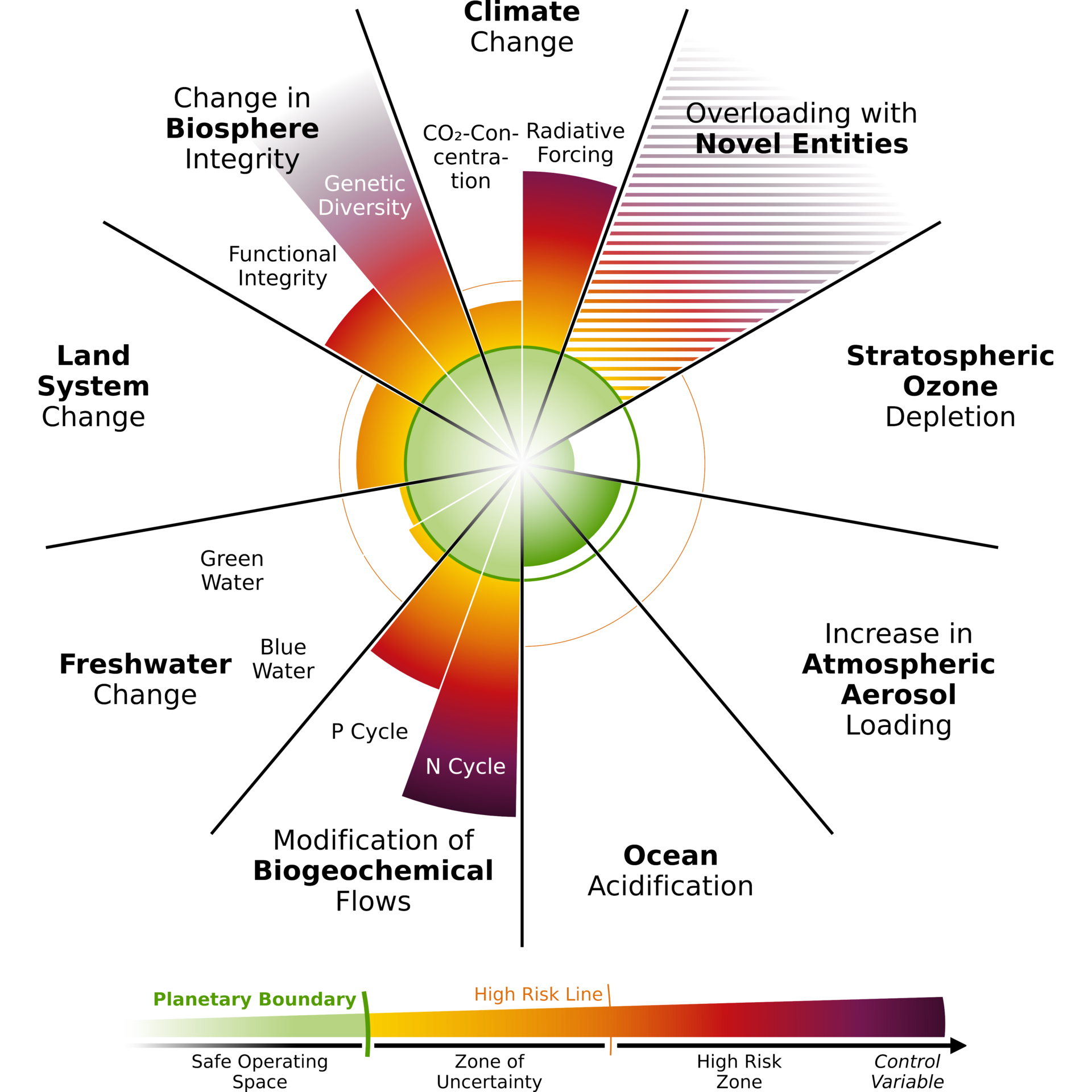 A team of researchers has helpfully enumerated each of the nine planetary processes that are essential for maintaining the stability and resilience of the earth as a whole. The extra large illustration below shows those nine systems, as well as the riskiness of their current state.